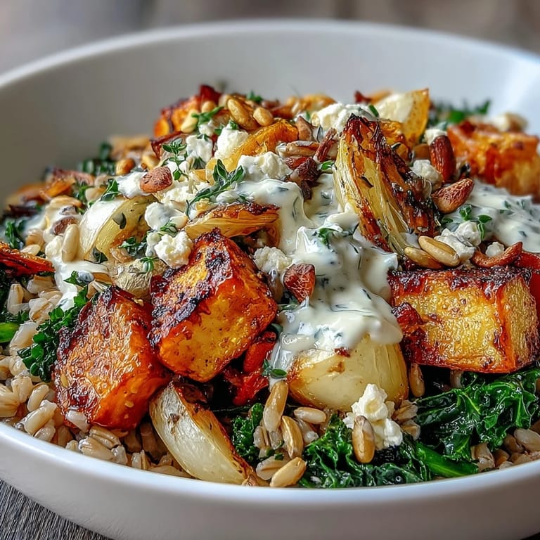 Cold months call for warm, grounding food, and this bowl delivers exactly that without feeling heavy or one-note. The roasted vegetables provide natural sweetness and substance, the grains anchor everything in a way that's deeply satisfying, and the creamy dressing ties it all together into something that feels intentional and nourishing. There's something almost meditative about building a bowl like this, watching the colors layer together—golden grains, caramelized roots, dark wilted greens, pale creamy dressing.
